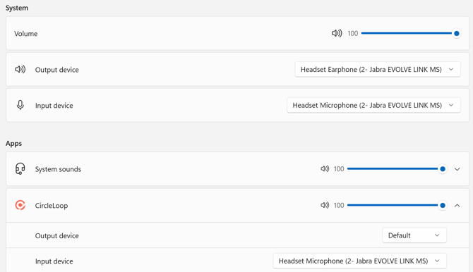In Volume Mixer, you can assign your headset as the main output and input device for specific apps like CircleLoop